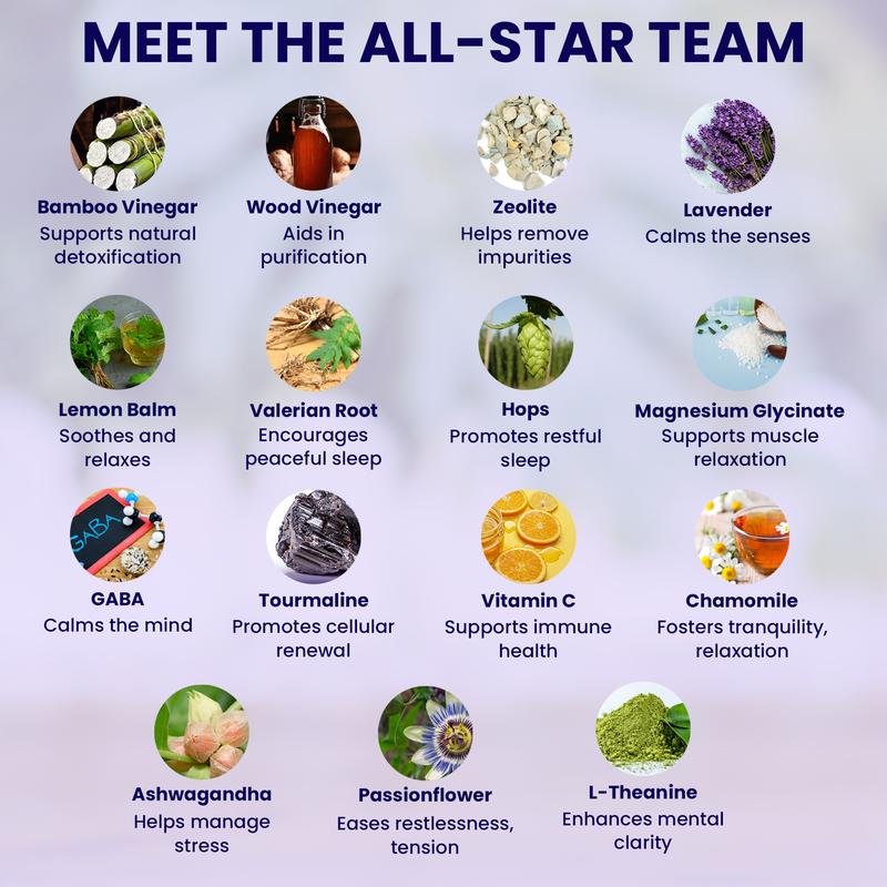 A thoughtfully curated blend of botanicals and minerals chosen to support relaxation, comfort, and overall well-being.